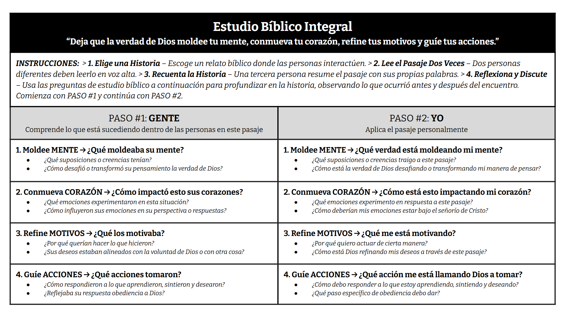 Este método de Estudio Bíblico Integral te ayuda a comprometerte plenamente con las Escrituras, no solo con la mente, sino también con el corazón, los motivos y las acciones. Primero examina a las personas en el pasaje (cómo pensaban, sentían, deseaban y actuaban) antes de aplicarlo personalmente. Esto evita malas interpretaciones, conecta la verdad con la vida real y fomenta un crecimiento espiritual duradero. A través de este método, pasamos de solo leer la Escritura a vivirla, siendo moldeados por la verdad de Dios en cada parte de nuestro ser. Finalmente, este método se alinea con el marco de Discipulado Integral que estoy promoviendo.